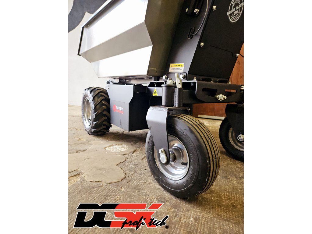 Objem korby je cca 210 l, nakladací objem až 350 l v závislosti od materiálu. Maximálne užitočné zaťaženie je 500 kg. Prechody do cca 20% nie sú pri zaťažení žiadny problém! Vďaka výkyvnej náprave sa s ním ľahko manévruje aj v teréne.
